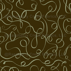Swirling lines in a looping pattern create a dynamic design on a chocolate brown background. Greenish-blue curves meander and intertwine, forming an abstract, organic composition.