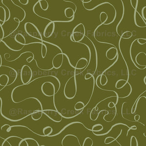 Swirling lines in a looping pattern create a dynamic design on a moss green background. Greenish-blue curves meander and intertwine, forming an abstract, organic composition.