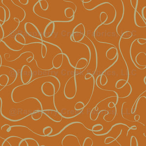 Swirling lines in a looping pattern create a dynamic design on a pumpkin orange background. Greenish-blue curves meander and intertwine, forming an abstract, organic composition.