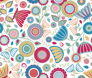 Nostalgic of mid century, retro design, this pattern features flowing, romantic Scandinavian flowers in country red, blue, yellow and white.