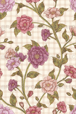 The Rose Garden pattern is a romantic, hand-illustrated floral design created with deep personal meaning. Designed for Jesika’s sister’s wedding, this pattern features gracefully intertwined roses in shades of pink and purple, with delicate foliage set against a soft, vintage-inspired gingham background. The intricate details and warm, muted tones give it an air of timeless elegance, making it perfect for heirloom-quality textiles, stationery, and home decor. Available for a limited time, this design will later be rereleased as part of the Roses & Birds collection, capturing the charm of nature with a story of love and celebration woven into every petal.
