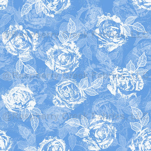 Layers of Rose prints in white on cornflower blue lace texture. Prints were made from a rose flower pressed into a gel plate. Roses are appx 3 inches across at default (150 dpi) scale.