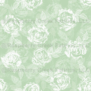 Layers of Rose prints in white on light sage green lace texture. Prints were made from a rose flower pressed into a gel plate. Roses are appx 3 inches across at default (150 dpi) scale.