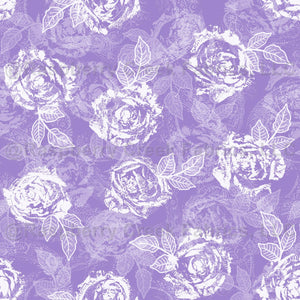 Layers of Rose prints in white on lilac lace texture. Prints were made from a rose flower pressed into a gel plate. Roses are appx 3 inches across at default (150 dpi) scale.