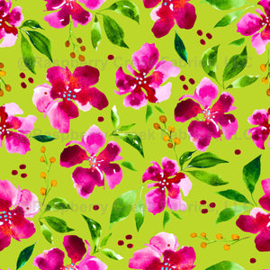Watercolor blooms in magenta and pink with green leaves and yellow buds on chartreuse green. Secondary Hero for Rouge Fleur Collection. Fabric, home decor