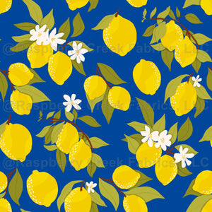 Royal Blue Yellow and White Lemon Print Fabric, 2025 Fruits by Brittney Laidlaw