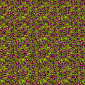 Ruby magenta floral with ruby berries, bright green leaves and dark green splatter on a light green background. Fabric, Home Decor, boho. Small Scale