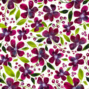 Ruby red magenta floral with ruby berries, bright green leaves and white with splatter.Large Scale, boho, watercolor. Fabric, Home Decor, Holiday