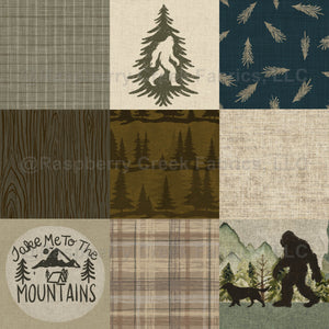 A cozy forest patchwork design mixing plaids, wood textures, pines and a playful Bigfoot scene. Perfect for warm, nature-inspired projects with an outdoorsy, cabin-ready feel.