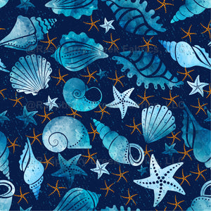 watercolor seashells with tiny orange sea stars on textured dark navy background