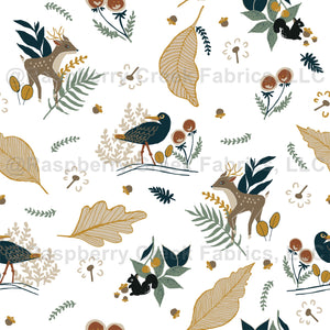 Sage Green Yellow Brown Tan Beige Orange Blue Teal Forest Deer Squirrels Flowers Leaf Wilderness Print Fabric Cross My Art LLC