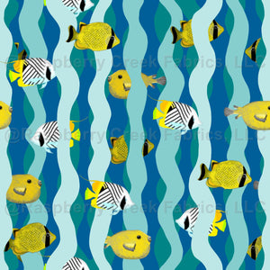 Bright yellow saltwater fish dart between aqua and turquoise streamers of kelp on an Ocean Blue background.