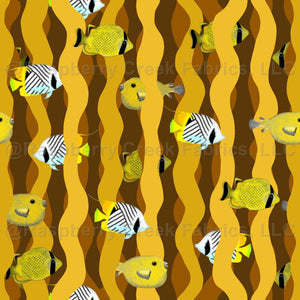 Bright yellow saltwater fish dart between orange and gold streamers of kelp on a cocoa brown background.