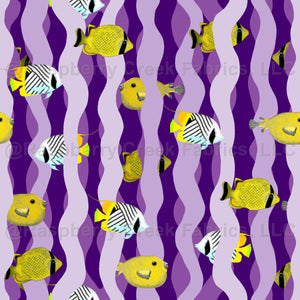 Bright yellow saltwater fish dart between lavender and orchid streamers of kelp on a purple background.