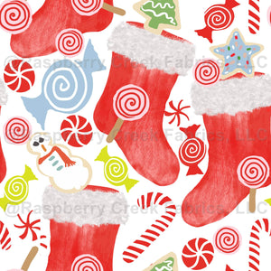 Santa Socks with Christmas, cookies and candies on a white background by V. Campos-Hallstrom, CLub Creative Art.