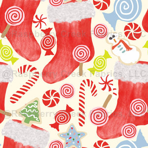 Santa Socks, cookies, and Christmas candy on a yellow background designed by Club Creative Art, V. Campos-Hallstrom.