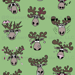 Santas reindeer sleighbell force lineart diagonals green. Comic-style Santa reindeer heads with red highlights. Vertical and diagonal lines. Perfect for holiday projects, décor, quilting, table cloth, napkins, totebags.