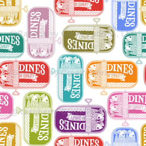 A whimsical, colorful pattern of vintage-style sardine tins packed with charm! Perfect for kitchens, dining areas, or quirky accessories, this design adds a fun retro twist with its playful fishy friends and bright palette.