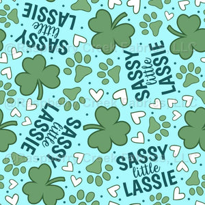 Sassy Little Lassie Shamrocks Hearts and Paw Prints Blue