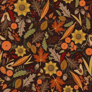 Scattered Autumn Leaves, Acorns, Seeds, Sunflowers in Warm Colors