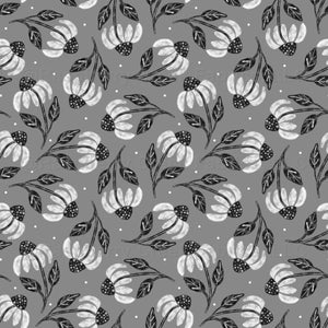 Digital Block Print style floral featuring black and white echinacea coneflowers on gray. Medium Scale, scattered, white dot details. Fabric, Home Decor