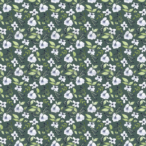 Watercolor floral in pale gray, white, and blue gray with darkest gray buds and green leaves on olive Green. Cool, botanical, vintage, scatter, small scale. Coordinate for the Heirloom Bloom Watercolor Floral Collection