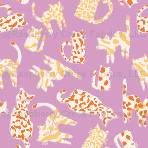 Cute kids conversational print. Bright leopard pint cats kittens with fun bright pops of colour. Scattered allover multidirectional layout. 16cm x 16cm seamless repeat tile