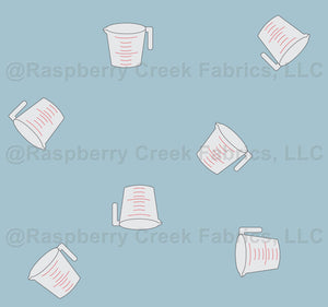 This design features liquid measuring cups scattered on a dusty blue background. This design would be fun for kitchen decor.