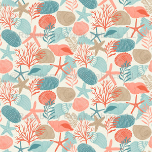 Sea life inspired pattern featuring seashells, sea stars and sea plants In blue, coral and tan.