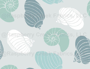 "Seafoam Serenity": Seashells in calming shades of blue and green on a pale aqua background. Perfect for coastal décor, nurseries, and tranquil spaces.