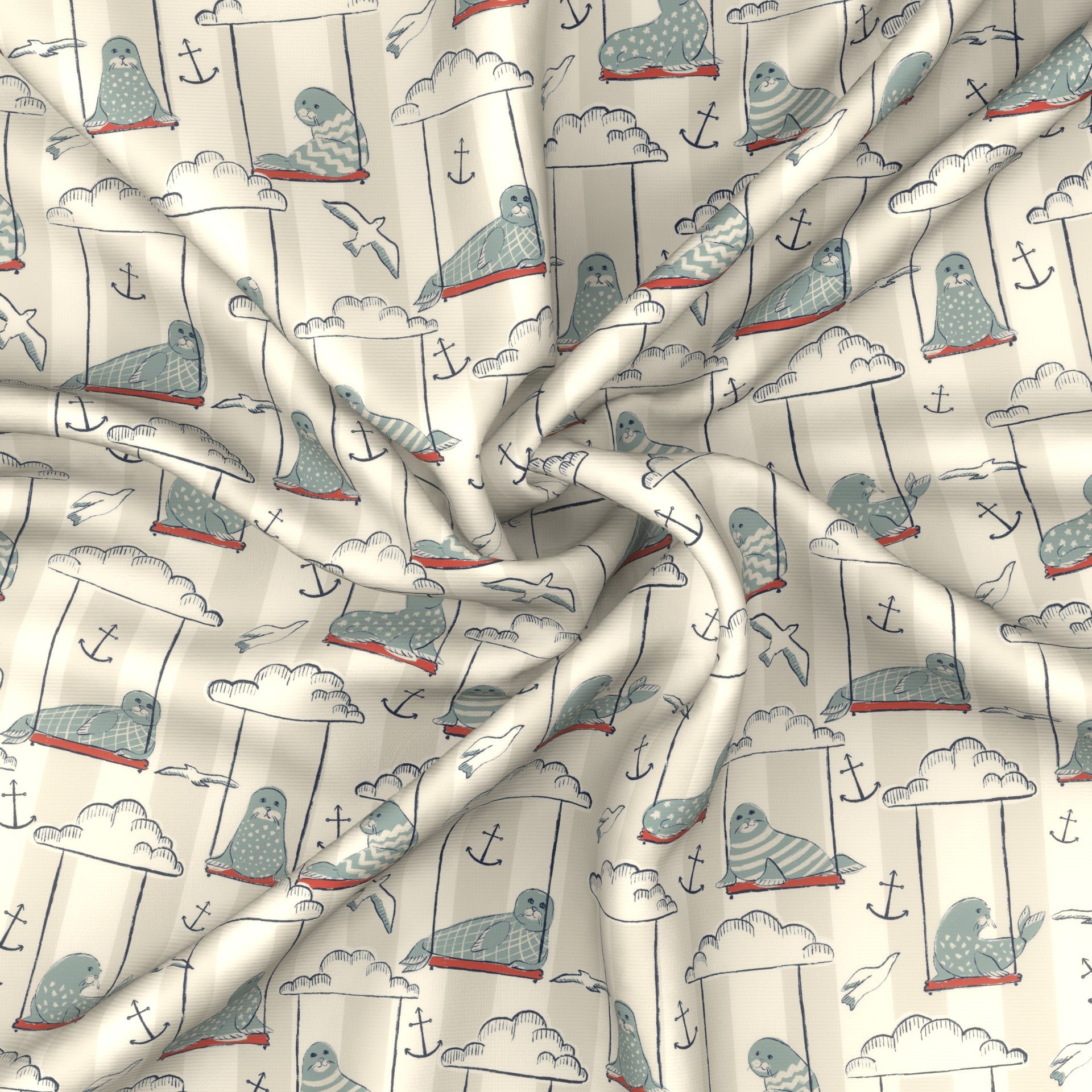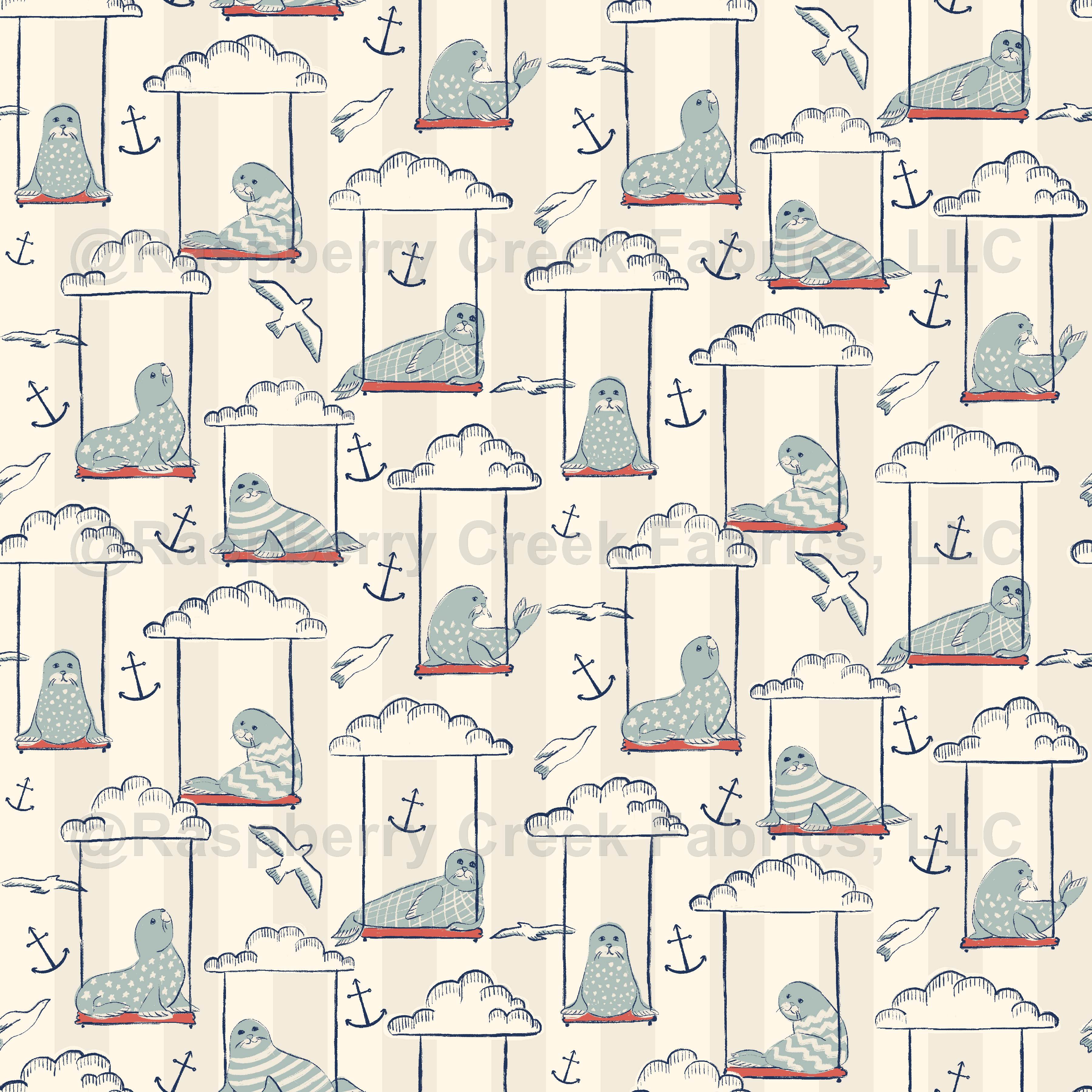 Delight in surreal seals on cloud swings. Modern, playful, painterly art with dreamy skies in white, blue and red details. Perfect for kids room.