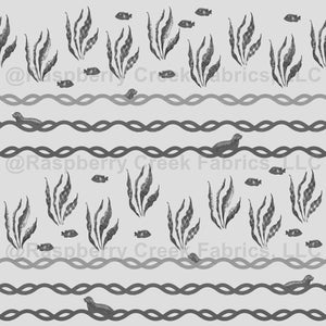 Cute little seals frolic in the waves between textured stands of seaweed on greyscale fabric.
