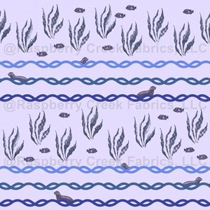 Cute little seals frolic in the waves between textured stands of seaweed on periwinkle fabric.