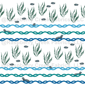 Cute little seals frolic in the waves between textured stands of seaweed on white fabric.