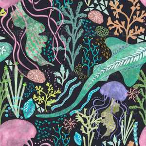 motifs like sharks, Jelly fish, seaweed coral & shell