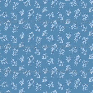 Marine life inspired print of tossed seaweed and coral in a monochrome blue palette.