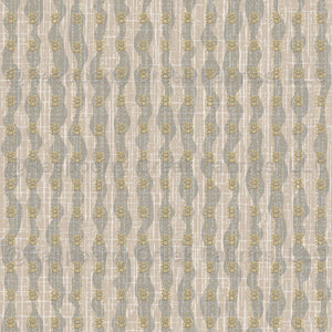 A muted, layered design featuring wavy lines, dashedshadowed motifs, and a textured overlay creates a rich pattern of enchanting Vanilla White, Blue, and Yellow stripes.
