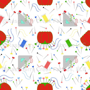 Tossed Sewing Notions on White - HST Addict Collection - Thread Pincushions Pins - 30s Style Prints - Tomato Red Royal Blue Grass Green Sun Yellow Light Gray Aqua