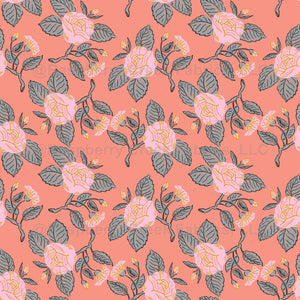 Shabby chic floral fabric, pink roses on coral