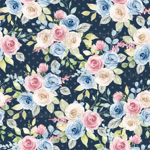 Shabby Pink Blue Cream Rose Bouquets on Navy with Soft Polkadots