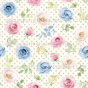 Shabby Pink Blue Cream Roses on Ivory Polkadot