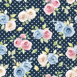 Shabby Pink Blue Cream Roses on Navy Polkadots