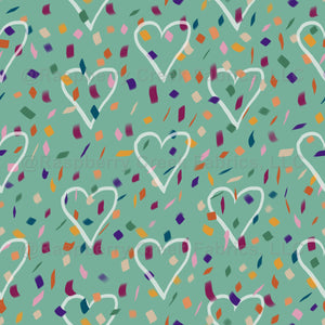 Brightly colored confetti pieces sprinkled over white heart outlines on a mint green background.