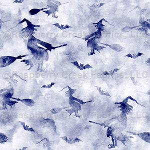 Silhouettes of smiling wicked witches flying on broomsticks. Navy blue