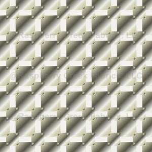 Silver green on cream riveted square metal plates in a gradient Industrial texture with metallic shine effect, for steampunk, modern décor, costumes, cosplay, quilting, unique fabric accents and projects.