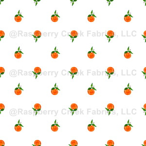 Watercolor orange citrus fruit with green leaves and tiny white orange blossoms on White. Coordinate for Marmalade.Spring, Summer, Fruit, Floral. Fabric, Home Decor, Kitchen, Cafe, Garden