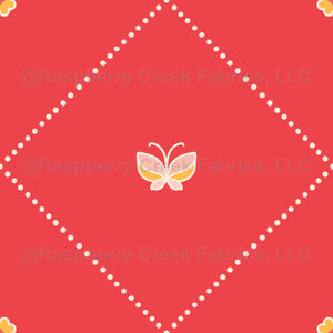 Red diagonal plaid coordinate with tiny dots, flowers and little butterflies.