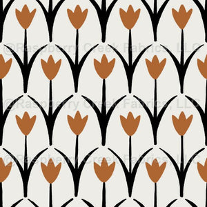 This minimalist boho floral design features small tulip-like flowers arranged in a clean, regular grid. The simple hand-drawn shapes in black and white are accented with a warm, rusty orange for a subtle pop of color. With its Scandinavian-inspired look and modern folk art feel, this pattern is perfect for sewing projects like baby clothes, accessories, home decor, or modern quilts. The small-scale floral makes it easy to mix and match with other prints from the collection.