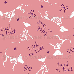 A spooky cute halloween print for dog lovers, with dog skeletons, cute bows and a hand written " trick or treat"message in calligraphy