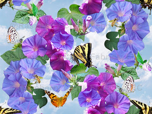 Bright purple Morning Glory vines reaching sky high on a warm summer day, with a delicate cerulean blue sky and soft fluffy clouds behind them. Yellow Swallowtail , orange Painted Lady butterflies and honey bees happily drink up the nectar of these beautiful flowers. This design is also available as Wallpaper